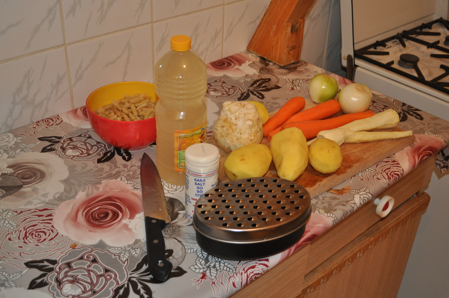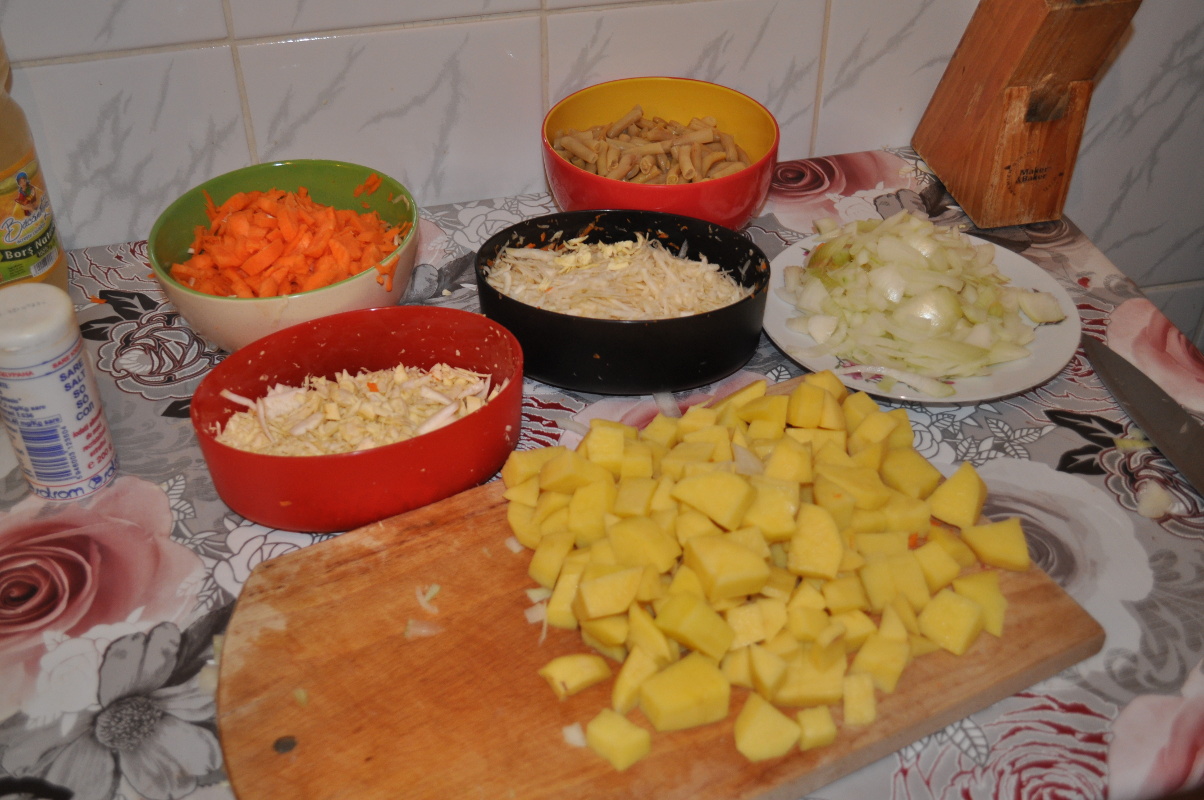 Se pune carnea la fiert. In timp ce fierbe carnea se curata legumele si se taie ( sau se dau prin razatoare ). Eu prefer razatoarea ca merge mai repede. Se scoate spuma de carnea fiarta daca vreti sa obtineti o ciorba “clara”. Dupa ce s-a fiert carnea se adauga in ordine catofii si ceapa , uleiul , sarea si mirodeniile , dupa 10 minute telina , pastarnac-ul si ceapa si se da in clocot. Dupa ce fierb bine ( se verifica cartofii cu o lingura ) se pun fasolea si borsul . Se mai lasa pe foc 20 minute si apoi se pun verziturile. Si e gata.